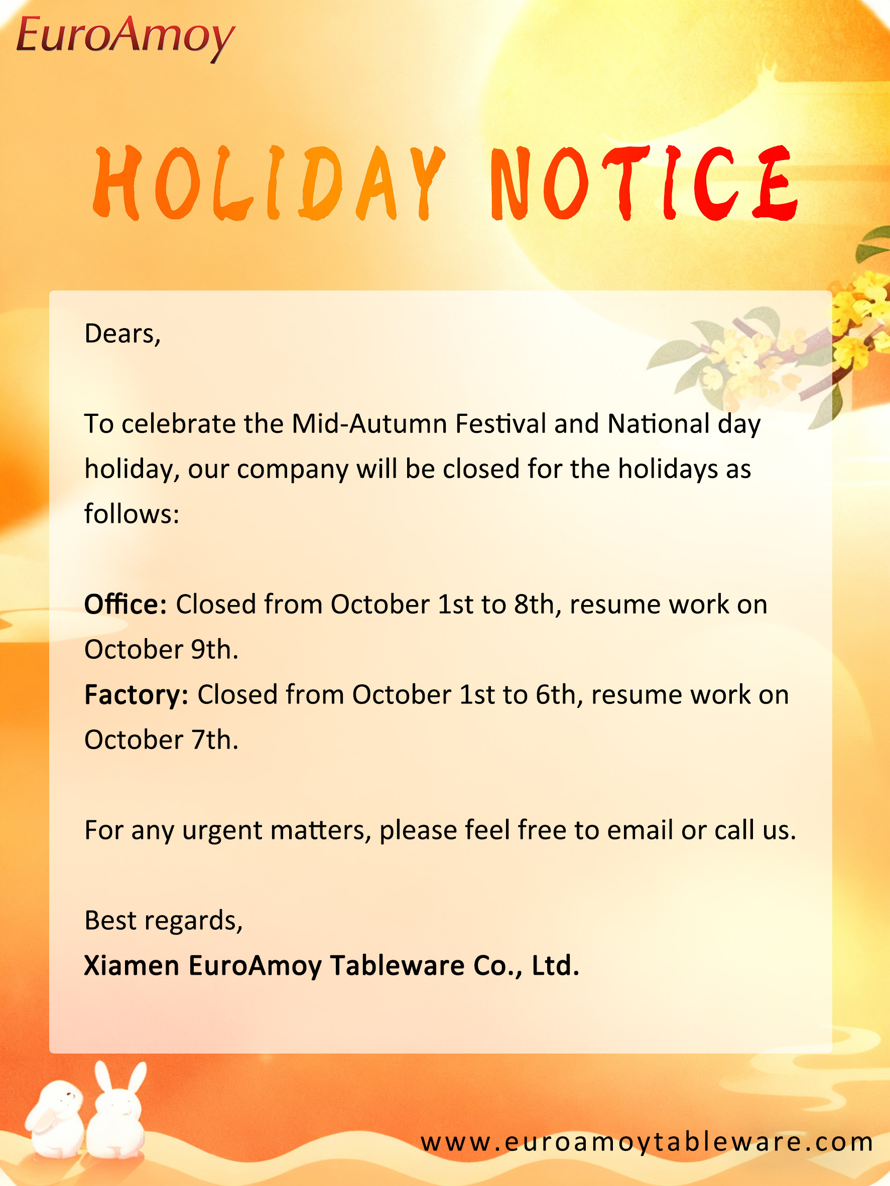 To celebrate the Mid-Autumn Festival and National day holiday, our company will be closed for the holidays as follows:
