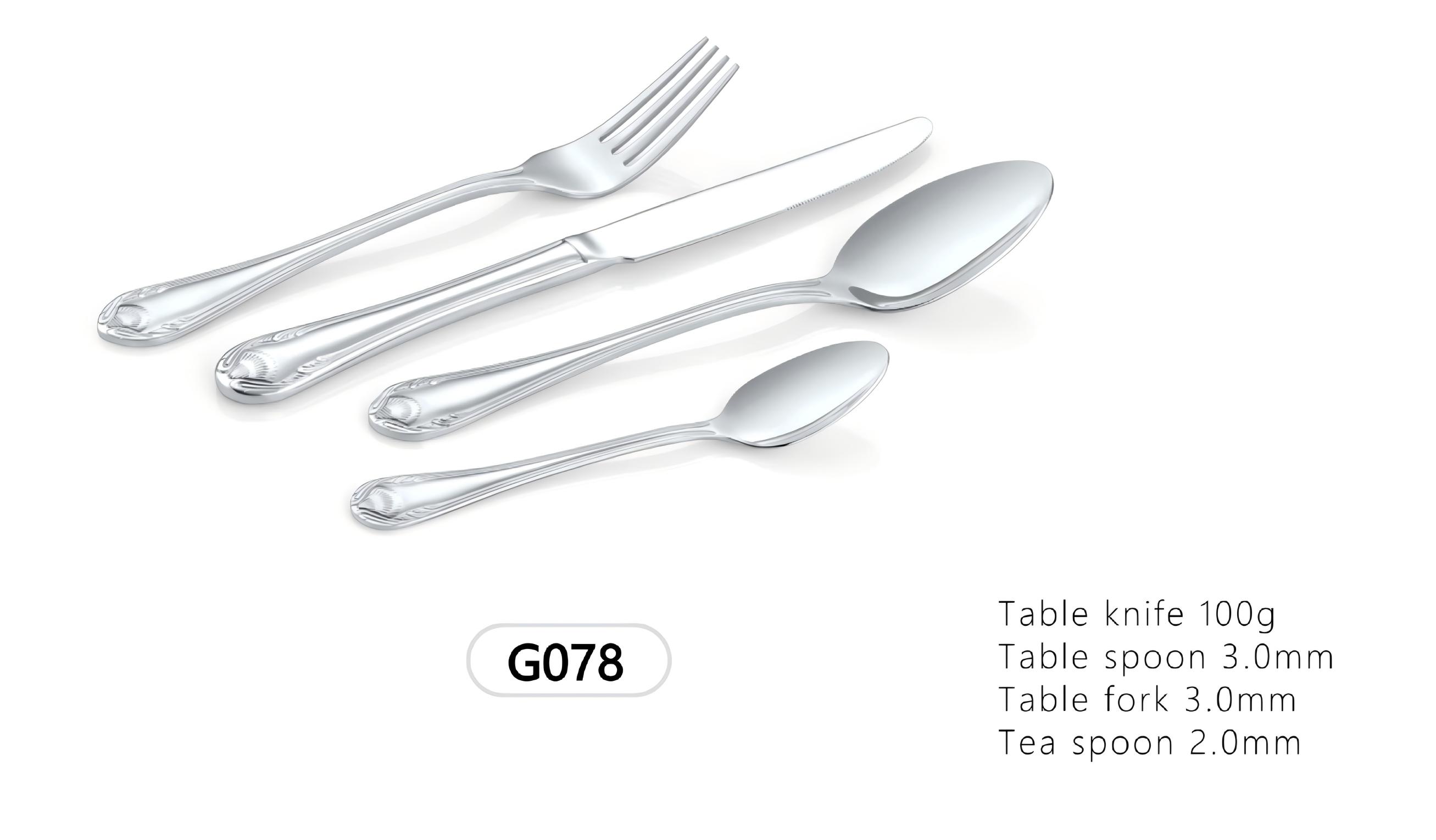 The fantastic flatware set G078 includes four basic pieces for casual dinners, made of 18/8 stainless steel material.